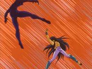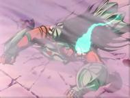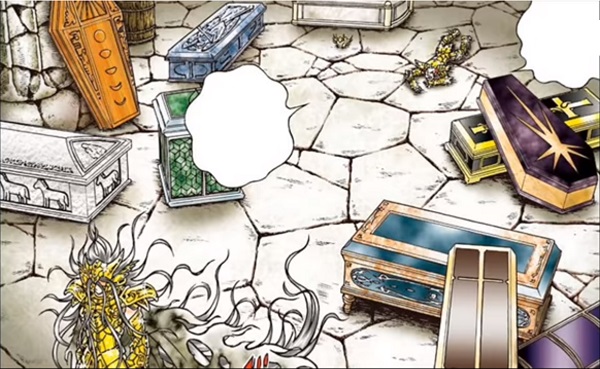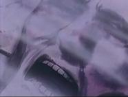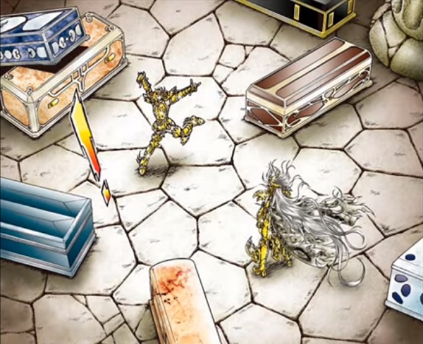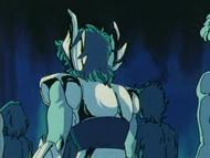 Cuando Deathmask se dispone a empujarlo a patadas, un sinnúmero de zombis aparece y rodea al Gold Saint, aferrándose a su cuerpo, son víctimas de sus atroces matanzas quienes lo odian por las torturas sin piedad que les infligió. No obstante, Deathmask no pierde la compostura y consigue deshacerse de ellos elevando su Cosmos, empujándolos y haciendo que caigan en el pozo del Yomotsu Hirasaka. Shiryu vuelve a atacar, golpea la pierna de Cáncer, pero la armadura de oro bloquea el golpe. El Bronze Saint del Dragón se pregunta cómo un hombre tan cruel pudo conseguir vestir una armadura de oro, símbolo de la justicia y de Atenea, mientras Deathmask continúa pisoteando sus manos. En ese momento la diosa Atenea aparece en los pensamientos de Shiryu y lo anima a perseverar. El Bronze Saint se propulsa fuera del barranco y prueba de nuevo un ataque con la mano sobre la pierna de su enemigo. Esta vez Deathmask siente dolor y observa con asombro como la coraza metálica de la pierna izquierda de su armadura abandonó su cuerpo. Shiryu lanza enseguida otro golpe a su brazo derecho y lo mismo ocurre de nuevo, la coraza se desprende del cuerpo de Deathmask, que acaba con un brazo y una pierna rotos.