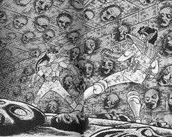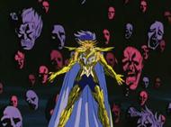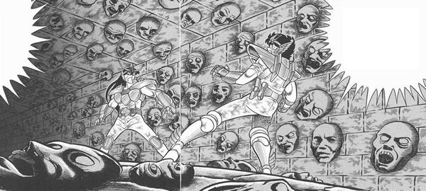 Ambos oyen una sonrisa pérfida, Deathmask de Cáncer se muestra por fin, el Gold Saint les explica que todos esos rostros pertenecen a sus víctimas. Hombres, mujeres y niños que ha asesinado sin piedad, ellos son sus medallas o trofeos, esos rostros torturados son una muestra de su poder y simbolizan el sufrimiento de sus almas que nunca encontraran el reposo en la casa de Cáncer.