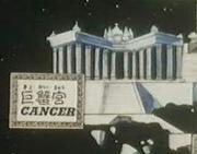CANCER / CARANGUEJO / CANCER / CANCRO: Es la cuarta de las doce casas del Santuario de Atenea, morada de Deathmask, Gold Saint de Cáncer, el más siniestro de los caballeros de oro, un guerrero sombrío que tiene una misteriosa conexión con la muerte. La cuarta casa evoca el miedo a la muerte pues Deathmask tiene por macabra costumbre tapizar los muros, el suelo y el techo de su templo con los rostros torturados de sus víctimas, a título de trofeos, Seiya y Shiryu calificarán este templo como “La casa de la Muerte”. Entre los 12 palacios este es aquel que concentra mayor maldad. Esta es la única casa que tiene una forma netamente diferente al resto, desde una vista aérea forma una cruz griega, dispuesta en X. Es probable que represente a la muerte, recordando las dos astas que junto a una calavera ondeaban en las banderas negras de los navíos piratas. En la parte alta de la puerta de acceso, en el centro de la X, está esculpido el símbolo zodiacal de Cáncer. Se desconoce si se puede entrar por los laterales.