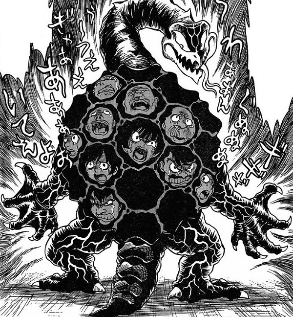 La asociación de los rostros macabros con este signo es quizás una alusión al célebre manga Devilman obra de Go Nagai, en el que el héroe combate en una ocasión a un demonio en forma de tortuga bípeda con una lengua bífida, un monstruo sádico y perverso llamado Jinmen (rostro humano) que cuando devora a una forma de vida (humana o demoníaca) arranca los rostros de sus víctimas para colocarlos en su caparazón donde sus almas son torturadas y no pueden encontrar el reposo. Tras matar a Jinmen Devilman hace referencia a su caparazón como Deathmask a los muros de su templo.