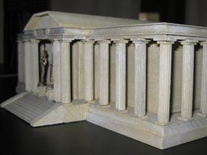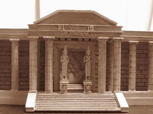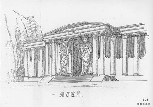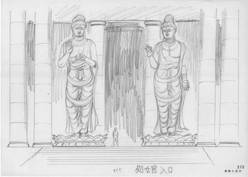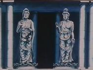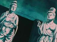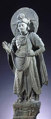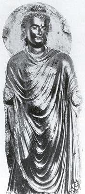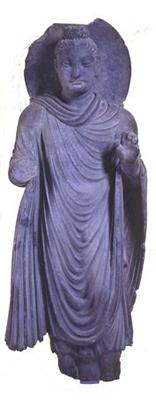La primera imagen (muy parecida a la estatua izquierda del templo de Virgo) es un Buda construido entre los siglos II y III de nuestra era. Esta escultura fue ejecutada en la región pakistaní de Gandharâ y pertenece al grupo de los primeros budas de tipo greco-romano, su estilo particular realza los pliegues de las ropas, se inspira en las obra griegas helénicas atormentadas (aquí la vestimenta personifica el alma serena o presa de la duda, según los espacios y las regularidades de los pliegues) el Buda de Gandhara duda interiormente, ello se transcribe en el aspecto trágico de la toga monástica. Los juegos de luces acentúan sus pliegues que forman una perfecta dualidad entre la luz brahmánica y las tinieblas de Mara. Al principio la civilización budista no representaba a Buda como una persona pero si como un símbolo, con las huellas de sus pies, el árbol bajo el cual meditó etc. Este arte anicónico finalizó en el siglo I. Hay que señalar que estas estatuas aparecen desprovistas de halo, señal de divinidad.