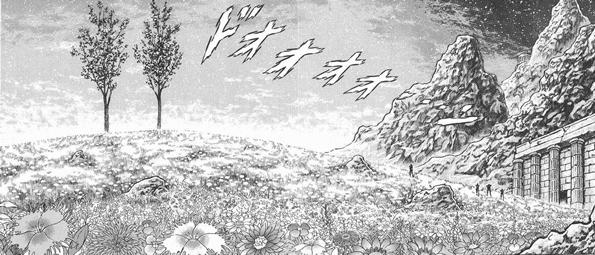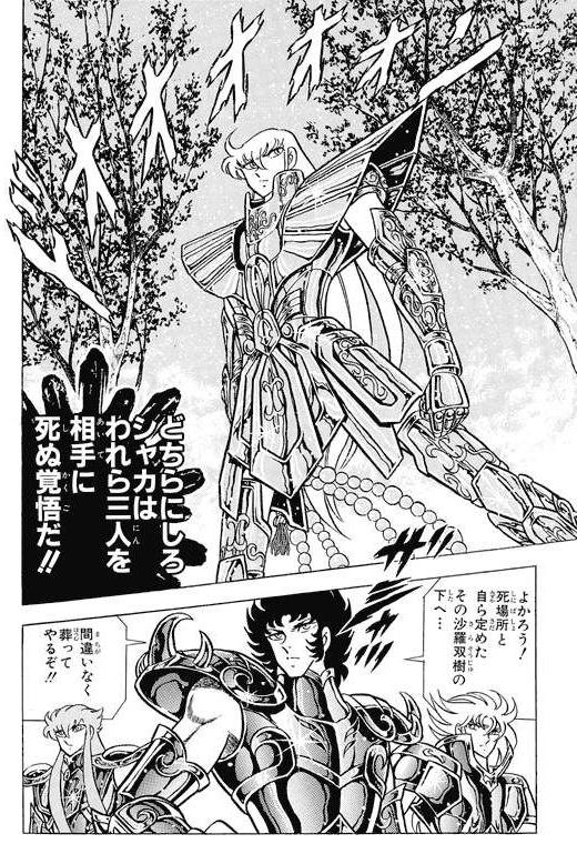 Jardín de los árboles gemelos de Sal En el manga y las ovas de la saga Hades se descubre que una puerta secreta se abre en el muro donde descansaba Shaka, y conduce a un gigantesco y hermoso jardín exterior en la parte trasera del templo, inspirado en el culto budista, un campo similar a los campos elíseos, el cual está completamente lleno de pétalos y hermosas flores esparcidas por todos lados, nadie no lo había visto aún, es un lugar que permanece desconocido durante la travesía de los caballeros de bronce (lo que sugiere que este lugar puede ser una especie de dimensión separada), un prado donde sobresalen los 2 árboles gemelos de Sala (沙羅双樹の園 pron. jp. sarasōju no en, literalmente 沙羅双樹: Salas gemelos, 園: jardín) con una misma silueta. Se trata de un lugar muy simbólico ya que fue aquí donde el histórico Buda encontró la muerte en la India, recostado entre dos árboles, y este lugar es el elegido por Shaka para perecer contra Saga, Shura y Camus que recurren a la Athena Exclamation.