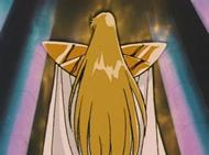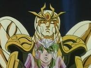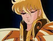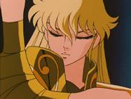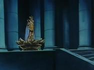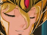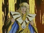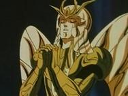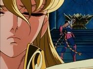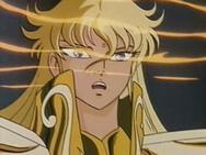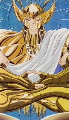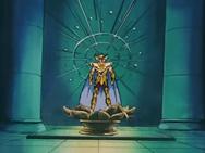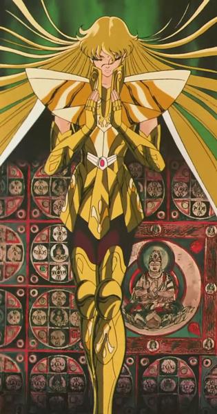 Tras atravesar el espejismo, los tres se adentran en el verdadero templo de virgo y llegan a una gran sala, donde el caballero de oro de Virgo los espera impasible mientras descansa, en una posición clásica de meditación budista, con los ojos cerrados y las piernas cruzadas, levitando sobre la representación de una flor de loto, suponemos que de mármol, que decora el hall. Para dar mayor más énfasis al nuevo adversario, a su espalda se levanta un muro que tiene esculpido en relieve destellos de luz, representando la iluminación del Buda.