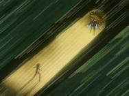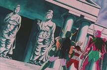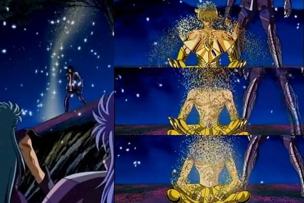 Al final del combate constatamos como el cielo se despejó de nuevo y se detuvo la lluvia. Las dos estatuas de Buda de la entrada fueron decapitadas por un rayo durante el duelo. La meteorología que acompaña a esta terrible lucha (un combate de culto entre los fans por su carga emocional y simbólica) tiene sentido. La lluvia que cae sobre el altar es el símbolo de la victoria obtenida entre lágrimas, las lágrimas de Shun después de la muerte de su hermano y las lágrimas de Cassios (enterrado justo después por Aioria, desgarrado por su sacrificio). De hecho, es en este punto cuando el Gold Saint de Leo lo entierra cerca de la casa de Shaina. La terrible tormenta que se desató sobre el Santuario tras el mediodía, y ese rayo devastador, son algo que simboliza el destino, que habría podido girarse en detrimento de los caballeros de bronce (Shaka era probablemente el oponente más potente al que nunca tendrán que hacer frente, además de ciertos dioses). El sacrificio de Ikki mostrará más adelante el camino a los demás, que se sacrificarán a su vez en las casas de Capricornio, Acuario y Piscis. Hay claramente una ANTES y un DESPUÉS de la casa de Virgo. El corazón de Shun se endureció, las palabras de su hermano permanecerán en su memoria durante mucho tiempo... El sol que vuelve a aparecer después de la tormenta simboliza la victoria contra el más terrible de los Gold Saints. Pero es un sol bañado por humedad. La humedad tras la tormenta. Es una victoria amarga y lograda con el dolor y las lágrimas....