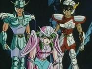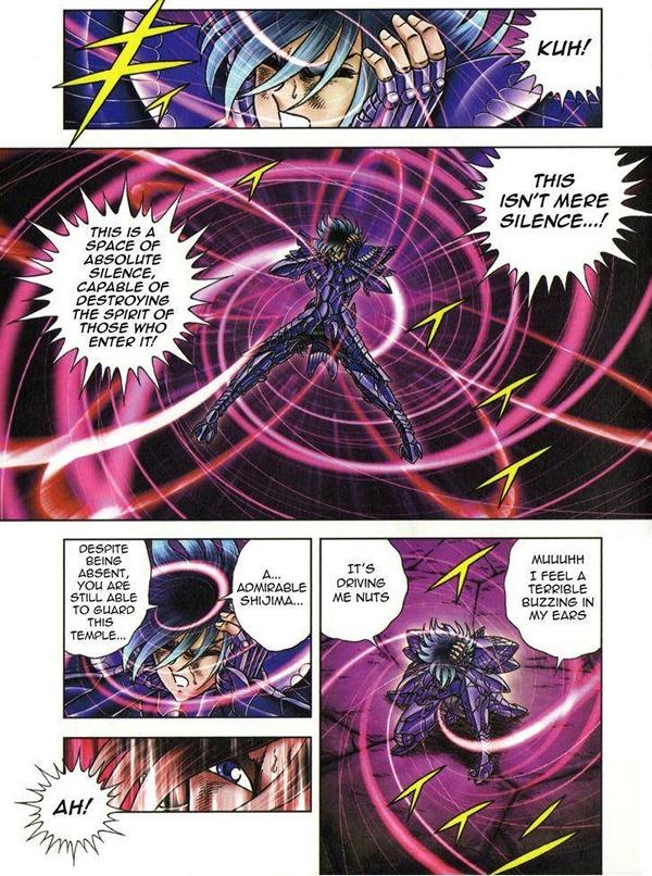 de Ikki antes de acabar con él. “Ya está, la única cosa que te une aun al mundo es el oído. Entonces, mientras aun puedas comprender alguna cosa, escúchame: Formo parte de los caballeros que han merecido vestir la armadura de oro, me he comprometido a luchar siempre por el bien y la justicia, y a no usar mis poderes por razones personales o maléficas. Y la única verdad que existe en este mundo vano es que... desgraciadamente, nada es seguro. No hay justicia perfecta así como no hay mal perfecto. Por las enseñanzas que he recibido, yo sé reconocer el bien o el mal cuando los encuentro. Y a mi conocimiento, el Gran Patriarca defiende... la justicia !. y por eso le sirvo, no por cobardía o por miedo. Ahora que he respondido a tu pregunta, voy a privarte de tu quinto y último sentido para siempre jamás. Que tus orejas sean sordas para la eternidad!!!.” (Shaka) Shaka le explica que, según su visión, no hay maldad perfecta ni justicia perfecta, pero él es capaz de diferenciarlos, y considera que el Maestro del Santuario representa a la justicia y a Atenea. Después de esto, Shaka le quita a Ikki su último sentido del oído. El Fénix cae a las tinieblas mientras la lluvia cae como lágrimas sobre la estatua de Atenea.