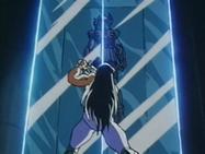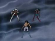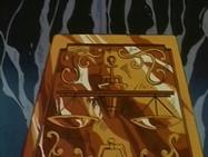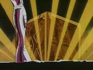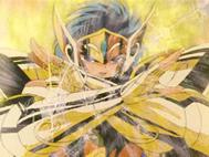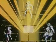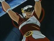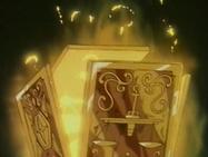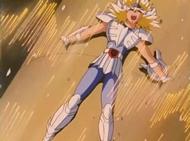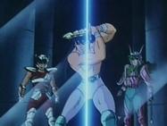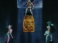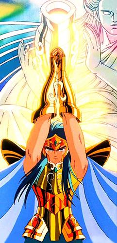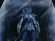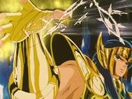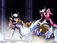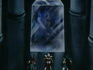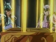 Inútilmente, Seiya trata de romper el hielo con su Golpe de Meteoro Pegasus Ryūsei Ken, que es absorbido por el hielo. Shiryu recuerda que su maestro le dijo que existía un Caballero Dorado que podía crear bloques de hielo que ni todos los Caballeros Dorados podrían romper. En ese momento, el suelo brilla y el templo tiembla, de algún lugar subterráneo del pavimento surge la caja de pandora que contiene la espectacular armadura dorada del Caballero de Libra compuesta de 6 armas dobles (12): tridentes, barras nunchakus dobles, barras nunchakus triples, bastones, espadas y escudos rotantes, cuyo poder podría destruir una estrella y que requieren el permiso de Atenea para ser usadas por los caballeros de oro.
