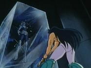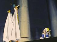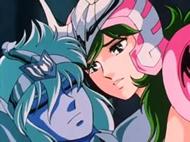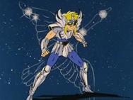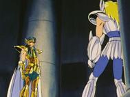 – difundido en Francia el 19 de septiembre de 1.987 – Es aquí donde Hyoga fue proyectado accidentalmente después de ser víctima del ataque dimensional del caballero de Géminis en el tercer templo, no ha dejado la realidad del aquí y el ahora, sólo se desplazó varias casas adelante, cayendo en la séptima que corresponde a Libra. Cuando recupera el aliento, se encuentra con su maestro Camus de Acuario, venido para la ocasión de su onceavo templo para detener y persuadir a Hyoga de no luchar. Hyoga rechaza obedecer a Camus e insiste en luchar en nombre de Atenea, pero Camus considera que ha sido engañado y lo golpea con ataques glaciales para tratar de razonarlo, pues no tiene ninguna intención de dejarle continuar su camino.