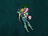 La armadura de Libra es la única que contiene 12 pares de armas, una para cada Caballeros Dorado, pues desde la era mitológica Atenea decidió que el único caballero que podría juzgar el uso de armas en la batalla debería ser Libra (Atenea repudiaba las armas, por eso sus caballeros explotan técnicas de combate a través de la energía del cosmo). Shiryu elige una de las espadas, con la cual logra romper por la mitad el hielo y sacar a su amigo Hyoga. Aunque el Cisne sigue inconsciente está con vida, estaba entre la vida y la muerte debido al congelamiento, así que Shun se ofrece a ayudar a Hyoga usando su cosmo energía para salvar su vida. Seiya y Shiryu se adelantan a la casa de Escorpio.