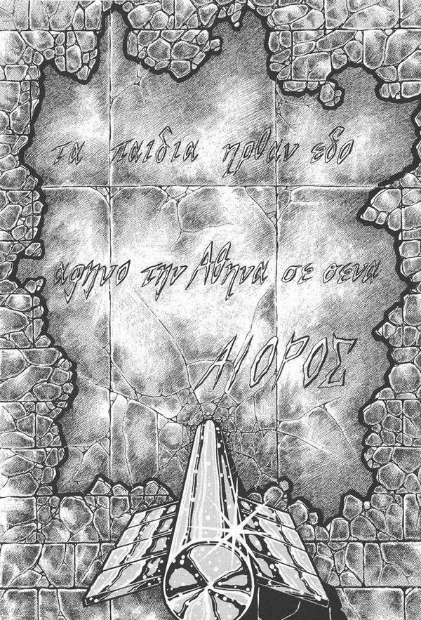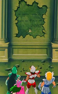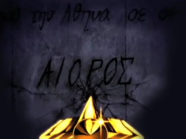 τα παιδια ηρθαν εδο αφηνο την Αθηνα σε σενα ΑΙΟΡΟΣ Latinizando la frase: Ta pedia erthan edo apheno ten Athena se sena AEOROS Está claro que 'griegorizaron' el término japonés (アイオロス "aiorosu"), que a su vez ya era derivado del griego (Αιολος o ΑΙΟΛΟΣ). Igualmente pudimos ver en otros pasajes y publicaciones comerciales de Saint Seiya el nombre del Caballero de Pegaso escrito también 'griegorizado', escrito (ΣΕΙΨΑ), o seja "SEIPSA", donde el "Y" del nombre es el equivalente del "PS" en la forma. "Ta pedia erthan edo apheno ten Athena se sena" La traducción seria la siguiente “A los jóvenes que vendrán les confío Atenea” Testamento