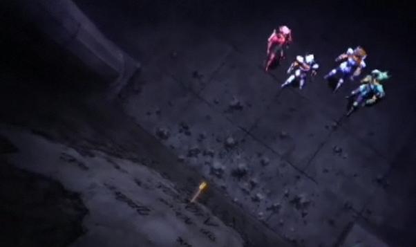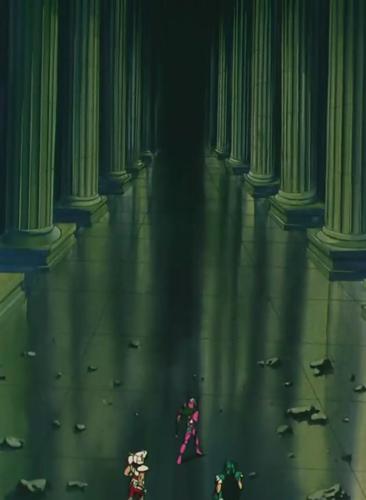un pasaje estrecho por el que se internan Seiya, Shiryu, Hyoga y Shun,