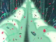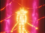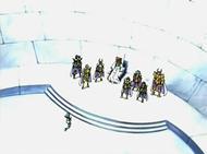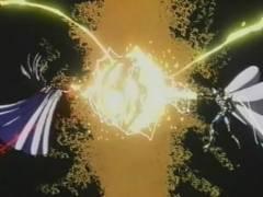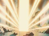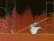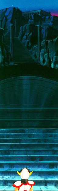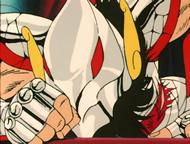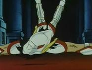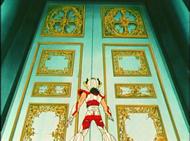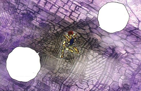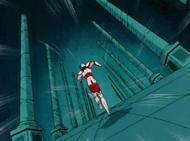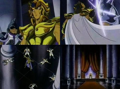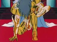 Ikki salta para evitar caer en el abismo, pero es interceptado por el puño de Saga que lo hace caer por la grieta y logra sepultarlo bajo los escombros. El Gold Saint de Géminis, despojado de su oponente corre hacia la estatua de Atenea para detener a Seiya, cuando este ya tiene el escudo en la mano. Todo tiene lugar en un ritmo frenético y estresante, lo que nos señala que quedan pocos segundos para que la última llama del reloj se apague.