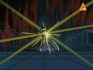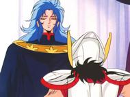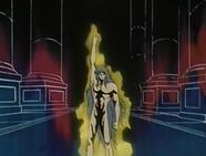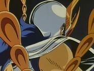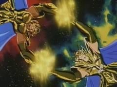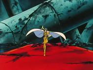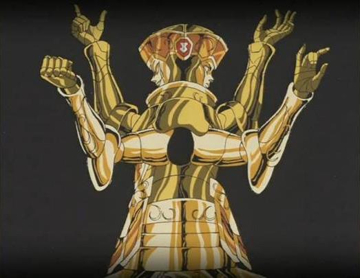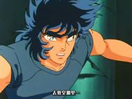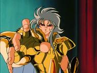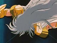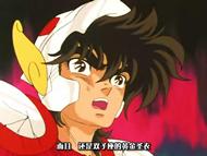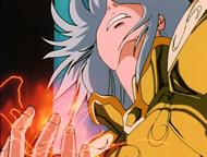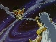 – difundido en Francia el 9 de abril de 1.988 – El Gold Saint de Géminis malvado logra imponerse a su otro yo y propina una serie de golpes secuenciales a Seiya que acaban por destruir sus cinco sentidos hasta dejarlo completamente inconsciente e indefenso, a su merced. Saga considera que ha alcanzado la victoria. Mu y Kiki están inquietos al ver que la duodécima llama del reloj zodiacal está a punto de apagarse, cuando Mu entra en contacto de repente con un Cosmos que le pide ayuda. Es Shaka de Virgo, quien le informa que se encuentra en plena deriva en una dimensión más allá del espacio y el tiempo, quiere que Mu le ayude a regresar al Santuario porque él es quien tiene los poderes telequinéticos más desarrollados de todos los Gold Saints. Mu le replica que es lo suficiente poderoso como para volver por sus propios medios, pero Shaka le responde que hay alguien que quiere llevar con él. Mu se compromete a ayudarlo e intensifica su Cosmos. En la Casa de Virgo, una luz dorada baña el Gold Cloth de Virgo. De repente Shaka está de regreso con su armadura y con Ikki en sus brazos.
