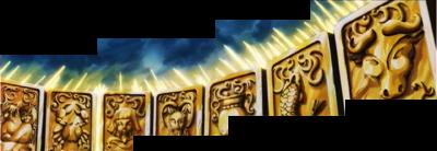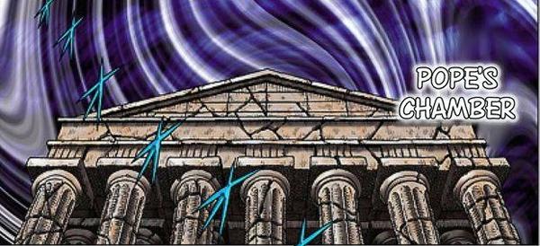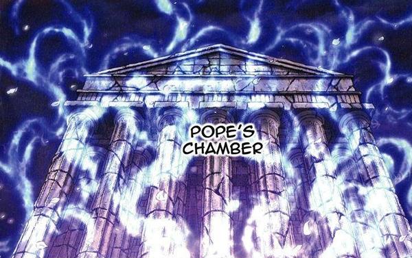 Hall o Pope Chamber (Cámara del Papa o Pontífice) Se trata de una gran y lujosa estancia pavimentada con azulejos, muy amplia y con el techo a gran altura (no sabemos si dispone de antesalas, pero es muy probable pues Aioria tuvo que lidiar con varios guardias antes de poder ver al Pontífice), presidida por el trono dorado, asiento oficial del Pontífice (la palabra trono procede del Griego θρόνος (tronos), "asiento, silla"), el cual tiene un significado simbólico y ceremonial importante, pues lo legitima como representante de Atenea. Fanart de Alexandre Tunis (Francia) Es una silla de metal que no permite reclinarse, presenta como ornamentos particulares bajorrelieves y la figura de un dragón tallado en lo alto del amplio respaldo y dos serpientes en los reposabrazos, el sillón es de grandes proporciones, más alto que la cabeza del Pontífice cuando reposa en el mismo, y está elevado en relación al suelo, debiendo subirse cuatro escalones (aunque varía según las imágenes). Transmite la sensación de lugar sagrado.