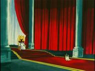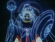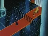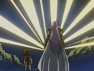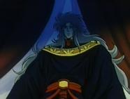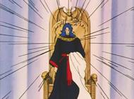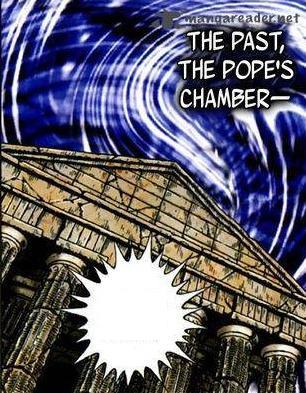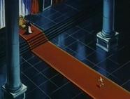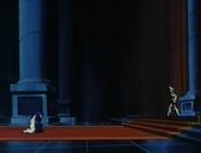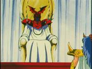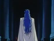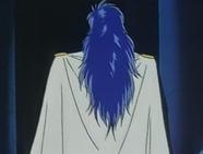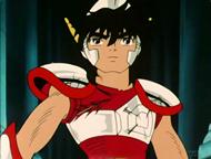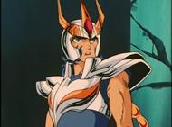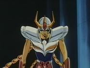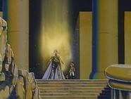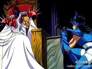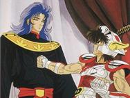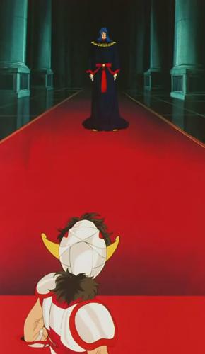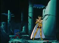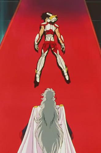 Seiya llega al Palacio del Pontífice y abre inmediatamente las enormes puertas de la sala del trono con otro Pegasus Ryūsei Ken. Entra y ve a un hombre con un casco de color escarlata que lo aguarda. Este se levanta y se quita el casco, revelando su largo cabello azul y una cara tranquila, ante el asombro del Saint de Pegaso. Con una voz suave el hombre felicita sinceramente a Seiya por haber logrado cruzar los doce templos, su actitud es completamente extraña. Seiya no se preocupa por los elogios, que suenan como un intento de disculparse, y lo ataca para obligarlo a ir a sacar la flecha de oro del corazón de Atenea. El Pontífice encaja el puño de Seiya sin hacer el más mínimo movimiento, y luego declara ser incapaz de retirar esa flecha. Seiya, incrédulo, se enoja porque cree que ha sido engañado y lo vuelve a atacar con un Pegasus Ryūsei Ken, pero este no produce ningún efecto sobre el Papa. De repente, el Pontífice empieza a llorar y pide disculpas por los crímenes que ha cometido. Seiya, aturdido, se pregunta si este Papa es la reencarnación del mal como habían creído.