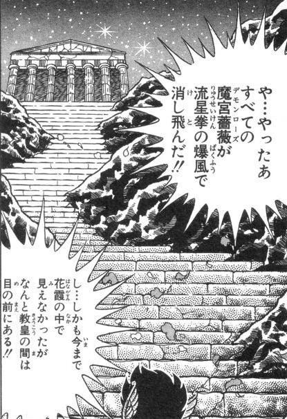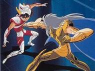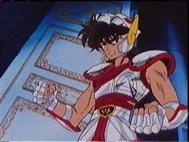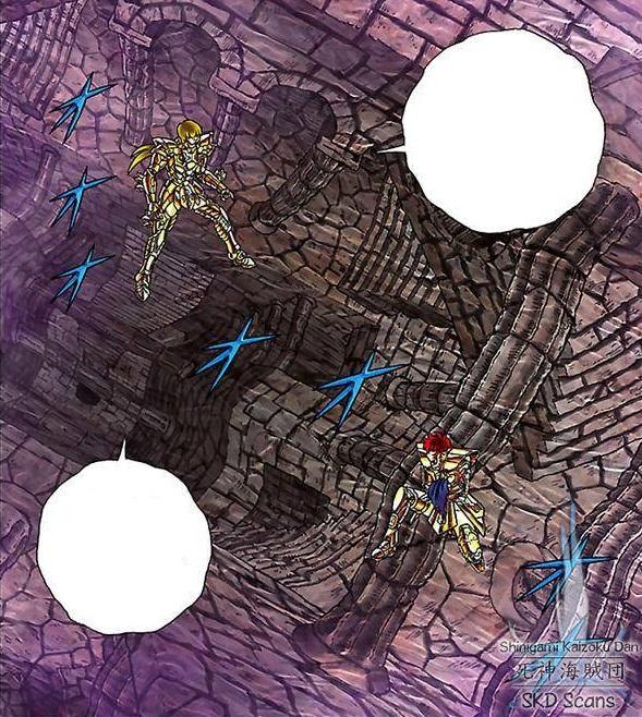 Esta es una imagen curiosa del manga e inédita en el Anime (que refleja aún más si cabe las variaciones y diferencias narrativas entre manga y anime), cuando Ikki cruza los templos de Libra a Piscis encuentra a Hyoga y Shun, aparentemente muertos, pero en la casa de Capricornio descubre a Shiryu, que ha sido transportado desde los cielos y salvado por la armadura de oro de Capricornio. Una escena que fue omitida en el anime, no fue hasta la saga de Asgard que supimos como sobrevivió Shiryu a su técnica suicida del "último dragón". El combate se recrudece, Seiya se levanta al límite de sus fuerzas y arde su Cosmos, el caballero de bronce está en inferioridad pues ha perdido todos sus sentidos e intenta como maniobra desesperada sus técnicas más selectas, prueba lanzar el Pegasus Ryūsei Ken a su enemigo, quien lo bloquea fácilmente. Sin embargo, los meteoros se vuelven más y más rápidos y empiezan a parecerse a los rayos de luz (como el Lightning Plasma de Aioria) y muy pronto Saga cae bajo los golpes de Seiya. Seiya cree haber derrotado a Saga y camina hacia la estatua de Atenea, guiada por esta a pesar de que sus ojos están ciegos. De repente, el Gold Saint se levanta en perfectas condiciones y le golpea directamente en el estómago. Seiya no se deja detener y se coloca detrás de su adversario para agarrarlo y salir volando por los aires con su Pegasus Rolling Crash. Los dos hombres vuelan por encima del templo del Pontífice y caen en picado hasta estrellarse en el salón. Seiya queda magullado y no puede levantarse, pero el impostor Saga se recupera con sus piernas intactas, Seiya está sumido en la desesperación de tener que enfrentarse a un oponente tan poderoso.