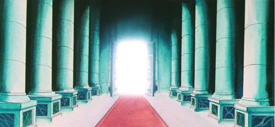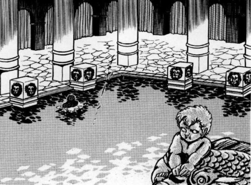 Sala / cámara de purificación La segunda parte de este palacio es más anodina, puesto que se trata de una zona de balneario, una enorme sala de aguas termales y baños de vapor privada del Pontífice, un oasis de paz y tranquilidad entre aguas donde nadie tiene el derecho a penetrar y donde el Pontífice se lava de vez en cuando para purificar su cuerpo, seguramente antes de reunirse con Atenea. Suponemos que sus servidores también deben procurarle masajes y otros tratamientos termales. Saga, en particular, utiliza muy a menudo este espacio para su comodidad personal, diseñado para relajar tanto su cuerpo como su mente y beneficiarse de las propiedades curativas del agua mineromedicinal a distintas temperaturas mientras hace reflexiones sobre sus malvados planes o la evolución de la batalla de las 12 casas. En el anime nunca se llegó a tener una visión completa de esta sala termal, tan sólo algunos planos cortos de Saga con agua, muros y columnas. En cambio en el manga existen algunas viñetas donde podemos apreciar mejor la estructura y decoración del balneario.
