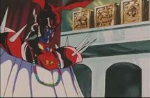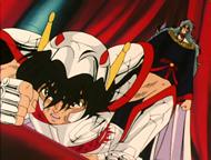 El falso Pontífice, que ha cambiado completamente de carácter, confiesa sus verdaderos planes, cuenta con recuperar el báculo de Niké con la muerte de Atenea. Armado con este y el escudo de la justicia, proclama que desafiará a Dioses y que podrá vencer a Zeus, Poseidón y Hades para reinar en la tierra y en el universo entero. Seiya utiliza de nuevo su Pegasus Ryūsei Ken, que sólo tiene el efecto de desgarrar las ropas del Papa y dejarlo desnudo. A continuación, este mueve un dedo y hace aparecer el Gold Cloth de Géminis, cuyas corazas cubren su cuerpo. Seiya se da cuenta entonces del secreto que rodea al Gran Pontífice, en realidad fue el Gold Saints de Géminis quien mató y usurpó el lugar del Pontífice del Santuario trece años atrás, un individuo que tiene dos caras, bien y mal.