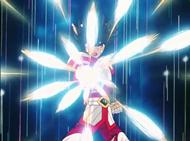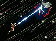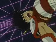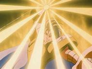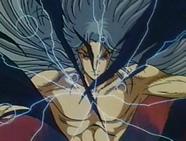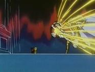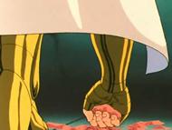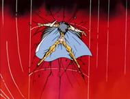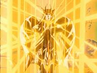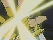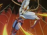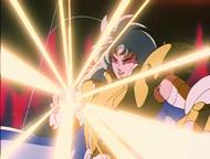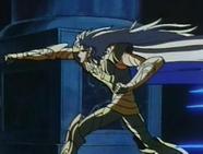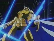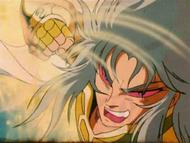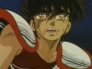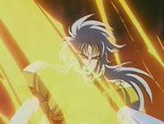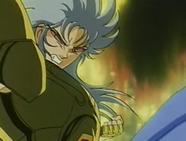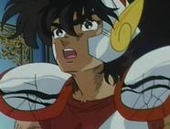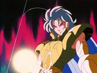 Seiya, impotente, es aspirado, pero el ataque termina abruptamente. Saga está de rodillas, presa de una lucha interna entre sus dos personalidades, lo que ha hecho perder efectividad a su ataque. La personalidad bondadosa le dice que no dejará que mate al Bronze Saint de Pegaso, pero la personalidad maléfica toma de nuevo el control y se enoja diciendo que ya habría conquistado el mundo hace mucho tiempo sin esas intervenciones constantes para molestarlo. Él dice que si es así, no matará a Pegaso, pero lo convertirá en un cadáver viviente, entonces envía un rayo a Seiya que destruye su sentido del tacto.