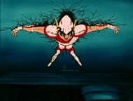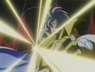 De inmediato Saga provisto de su armadura de oro, golpea sin piedad y sin pausa a Seiya, ya que si lo mata, nadie podrá detener su ambición maligna, para rematarlo utiliza la técnica Another Dimension.