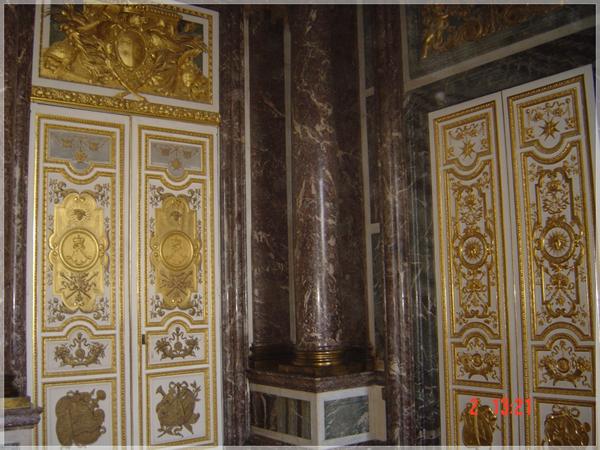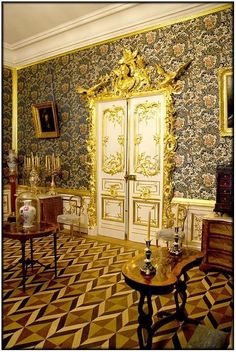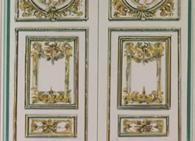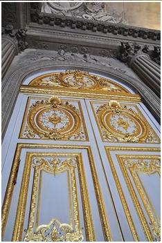 La sala cuenta con una doble puerta de acceso blanca con hojas policromadas con oro en el relieve, aparentemente sin picaporte ni cerradura, cuyos cuarterones (inferiores, intermedios bajos y principales) están decorados con motivos vegetales y con filetes dorados a la hoja, de un estilo barroco (propio de los palacios clásicos franceses del siglo XVIII) que se manifiesta en una inclinación hacia la exageración de lo suntuoso y recargado, que es característica fundamental de este movimiento.