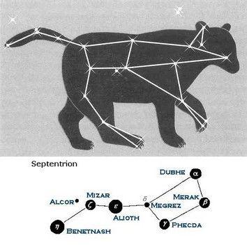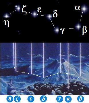 En la saga de Asgard cada guerrero divino representa a una estrella de la Osa Mayor (¿fragmentación?). No hay que olvidar al Septentrión... La estrella Polar (Polaris) que es el pilar del hemisferio Norte, guía esas 7 estrellas que los antiguos llamaban el Septentrion. Actualmente esta constelación es un asterismo de la Osa Mayor (es decir un agrupamiento de estrellas, pero que no es una constelación entera... así como la Cruz del Norte en la constelación del Cisne).