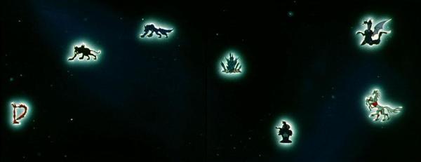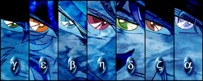 Alfa, Beta, Gamma, Delta, Epsilon, Dzeta, eta... un poco de astronomía para situarnos... en astronomía, las constelaciones son constituidas por estrellas más o menos brillantes... por convenio se clasifican las estrellas según su magnitud con letras griegas... así, Alfa, primera letra griega, corresponde siempre a la estrella más brillante... Gamma es la tercera estrella más brillante... etc. En este caso examinamos las estrellas de la Osa Mayor: Los 7 guerreros divinos de Asgard corresponden a una de las 7 estrellas principales que constituyen la forma de cacerola de la Osa Mayor o gran carro... Así Siegfried de Dubhe guerrero divino de Alfa, corresponde a la estrella principal de la Osa Mayor: Dubhe. Se comprende así que los guerreros divinos no son caballeros de bronce, oro o plata como los que ya conocimos, que se correspondían con constelaciones precisas, sino una casta aparte de guerreros que se corresponden con la constelación de la Osa Mayor, pero cada uno teniendo su propia estrella protectora...