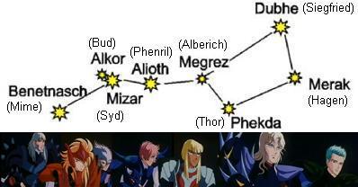 Dubhe (Alfa) : Basado en la criatura mitológica Fafnir (Doubhe), el dragón muerto por Sigurd (Siegfried). En la Saga de los Völsungar, Fafnir es uno de los hijos de Hreidmar y hermano de Reginn, el herrero. Se apoderó del oro de Andvari, pagado por los Aesir como compensación por la involuntaria muerte de Ott, su otro hermano, y luego se convirtió en dragón y duerme sobre el oro. Posee además un yelmo de terror. La leyenda sobre el tesoro atrajo a muchos aspirantes a héroes hasta su cubil, en busca de fama y fortuna. La mayoría encontraron la muerte despedazados fuera de la cueva, pero el joven Sigurd, armado con la espada de su padre y guiado por Reginn, engañó al dragón y se apoderó de su tesoro maldito. Merak (Beta) : Basado en la criatura mitológica Sleipnir (MERAK), el caballo de ocho patas que pertenecía a Odín. Era belicoso y le agradaba el combate. Constantemente se perfeccionaba, y sus técnicas de ataque se basaban en la fuerza de dos elementos opuestos: el hielo y el fuego. Phekda (Gamma) : Basado en la criatura mitológica Midgardsormen (PHECDA) una serpiente que vive en el mar que rodea la tierra. Igual que su hermano Fenrisulven, Midgardsormen se crió en Asgard. Cuando se hizo demasiado grande, Thor la tiró al mar para ahogarla. No podía matarla en la tierra, porque se derramaría su veneno envenenando todo a su alrededor. Se había predicho que lucharía con Thor cuando llegara Ragnarok y que se matarían mutuamente. Megrez (Delta) : Basado en la criatura mitológica Álberich (MEGREZ), cuyo nombre significa "elfo poderoso", que curiosamente era rey de los enanos, y al que según el Cantar de los nibelungos derrotó Siegfried. Los enanos eran seres sino malvados, al menos de poca confianza. Vivían en los bosques y montañas y se dedicaban a la minería, por lo que eran grandes herreros y orfebres. Este Álberic, además de todo eso, era un poderoso mago. Mizar (Zeta) y Alcor (estrella doble): Basados en la criatura mitológica Grendel (MIZARD Y ALCOR), era un monstruo acuático casi en forma de tigre; invulnerable a las armas, y perseguido por el guerrero Beowulf hasta su cueva, donde murió desangrado. En esa misma cueva Beowulf tuvo que enfrentarse a la madre del monstruo, a la que también derrotó Alkaid (Etha) : Basado en la criatura mitológica El Herrero Mime (BENETA) (también llamado Reginn), que recogió y crio a Siegfried a petición del Rey, su padre. Mime era hermano de Fafnir, que tras matar a su padre para apoderarse de su tesoro, se convirtió en dragón para protegerlo. Mime, consciente de la situación, envió a Siegfried al bosque a buscar carbón vegetal. En el bosque Siegfried se encontró con la bestia y se deshizo de ella. En una contraparte en la mitología nórdica también se le representaba por todo lo bello por su interior, siendo lo más adecuado en su representación es el arpa. Alioth (Epsilon): Basado en la criatura mitológica Fenrisulven o Pernil (Alioth) Llegó a Asgard siendo un cachorro para que los dioses lo vigilaran, pero en seguida se hizo muy grande y sólo el dios Thor, Tyr, se atrevía a darle de comer. Se había predicho que él y su familia serían los responsables de la destrucción del mundo, por lo que al final los dioses querían atarle. Lo intentaron con dos cadenas distintas, pero Fenrisulven rompió las dos. Al final los dioses acudieron a los enanos herreros, quienes hicieron una cadena con 6 cosas: las pisadas de un gato, la barba de una virgen, las raíces de una montaña, los sueños de un oso, el aliento de un pez y el escupitajo de un pájaro. Fenrisulven ya no se fiaba de los dioses aunque Gleipner más bien parecía un hilo de seda, y dijo que sólo se dejaba poner la cadena si alguno de los dioses se atrevía a meter el brazo en su boca. El único que se atrevió fue Tyr. Fenrisulven quedó atrapado por Gleipner y Tyr perdió el brazo. Permanecerá atado hasta el día de Ragnerok.