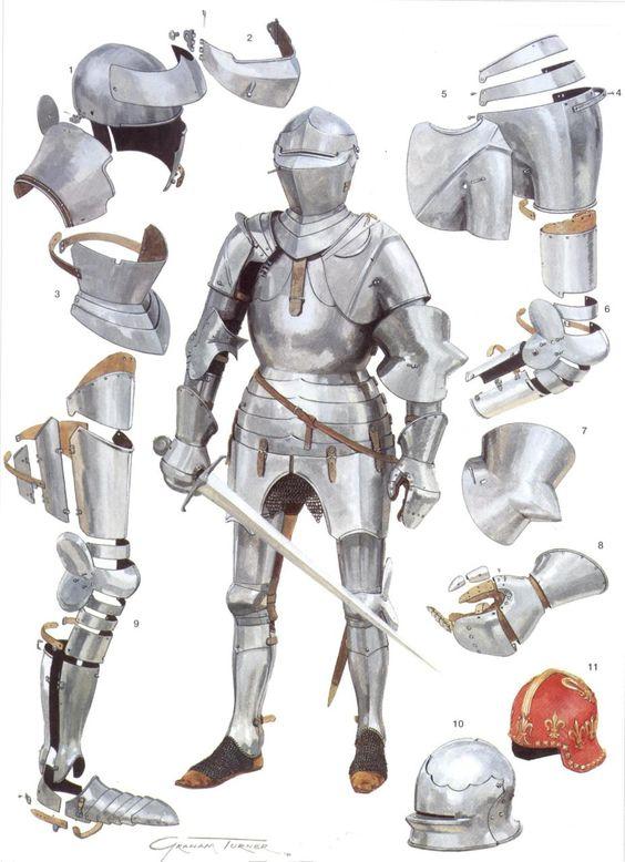 El Arnés o armadura completa (se usaba ya en el siglo XV y principios del XVI) constaba de numerosas piezas articuladas hechas de hierro o acero que cubrían todo el cuerpo del caballero, habiendo llegado a reunirse hasta el número de 250 en un solo combatiente con el peso de unos 35-40 kilos, (pero las más comunes e importantes se reducen a unas 25), unidas y distribuidas por piezas en los cuatro grupos de cabeza, tronco y extremidades superiores e inferiores permitiendo la movilidad. Por lo general por debajo vestía una armadura de cuero para reducir los impactos de manera eficiente, esas armaduras eran extremadamente caras. Las armaduras tanto por su diseño en el país de origen, como por su antigüedad, no iban compuestas con las mismas piezas (también se hicieron armaduras para los caballos). Las corazas eran una impresionante obra de ingeniería medieval repleta de detalles que tenían como fin desviar los golpes de las armas desde donde vinieran, y a la vez permitir la mayor movilidad posible al usuario. En efecto, con una coraza puesta se puede uno mover perfectamente, y tan sólo se verá constreñido para algunas posturas extremas que no se solían adoptar mientras se lucha. Con una coraza se puede pelear, correr, cabalgar y lo que hiciera falta, y por supuesto se puede uno subir normalmente al caballo y levantarse si se cae. Como detalle revelador, podemos comprobar que lo que acabó convirtiendo a los escudos en obsoletos fue precisamente la armadura de placas, y podemos estar seguros de que eso no habría sucedido si ésta no fuese extremadamente efectiva.