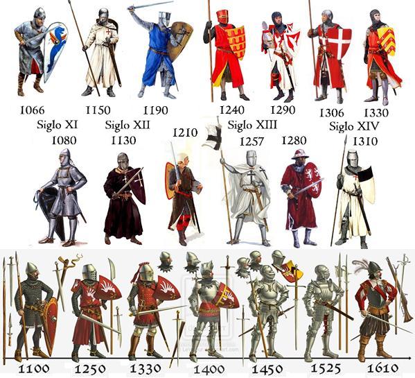 Armaduras medievales occidentales Las armaduras medievales europeas, realizadas en acero (o algún tipo de metal) y que cubrían todo el cuerpo, fueron un elemento esencial para los caballeros de la Edad Media y principios de la Edad Moderna (podemos encontrarlas ya en el siglo XIV y será el XV su época de esplendor), resguardándoles ante las acometidas que pudieran sufrir con espadas u otras armas. Las armaduras de los caballeros se solían usar en combates, torneos y en enfrentamientos bélicos. Bajo las placas de la armadura los guerreros usaban una cota de mallas o loriga, una pieza ligera hecha de un tejido de anillas de hierro o acero unidas formando una camisa (básicamente consiste en una serie de entrecruzamientos de anillos o argollas de metal pequeños, entrelazados entre sí en un patrón complejo que se denomina 4 en 1, es decir un anillo sujeta cuatro) hasta las rodillas, ceñida por un cinturón y abierta por delante y por detrás para poder cabalgar. Llevaba un capuchón para proteger el cuello, nuca y barbilla. Esta ayudaba en la defensa de objetos punzantes, y fue un equipamiento de uso frecuente en combate, junto con la armadura. Fueron agrandandosé hasta cubrir las manos, con unas manoplas, y las piernas. Posteriormente se reforzaron en codos, hombros y rodillas con placas de hierro, además de tejer mallas dobles o triples. Las cotas de malla venían a pesar entre 14 y 20 kilos, y son un tipo de armadura extremadamente flexible, que se adapta al cuerpo del usuario y no le impide ningún movimiento por amplio o complicado que sea. Casi todo su peso descansa sobre los hombros del guerrero, y ahí reside su mayor incomodidad, pues cargaban y fatigaban la espalda, hasta que uno se acostumbraba claro. Eran efectivas para detener los tajos de casi cualquier arma y las cotas remachadas podían parar casi cualquier flecha, con la excepción de las de los arcos largos y las ballestas. Su mayor defecto es que no reducen los efectos aplastantes de las armas contundentes, y llevarse un espadazo de lleno podía significar la rotura del hueso, aunque no se sufriera el corte.