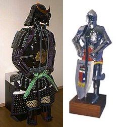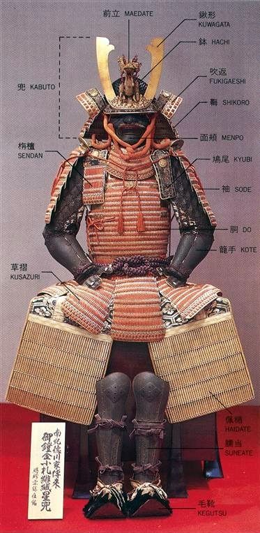 Armaduras medievales japonesas Los Samurai son guerreros legendarios y tal vez la clase más conocida del antiguo Japón. Eran guerreros nobles que lucharon siguiendo un estricto código moral que rige toda su vida. Lo más extraño de los samurai es probablemente su aspecto, su armadura ornamentada (Yoroi), generalmente se hicieron con materiales muy diferentes a las occidentales, Japón es una tierra muy pobre en minerales, y muchas veces a lo argo de su historia debieron importar materias primas (minerales), de su vecina China. Sin embargo, cada pieza de ella era funcional. La armadura samurai, a diferencia de la armadura usada por los caballeros europeos, siempre estaba diseñada para la movilidad. Una buena armadura tenía que ser fuerte, pero lo suficientemente flexible como para permitir el movimiento en el campo de batalla. Las armaduras japonesas son prácticamente del siglo XVII, estaban hechas de chapas lacadas de cuero o metal, cuidadosamente unidas por cordones de cuero o de seda, tejido que podría ser también algodón, o incluso un tejido derivado de la paja de arroz, cuero endurecido y con manos de tinta que endurecían el cuero, tiras de cuero que unían las diversas plaquetas de cuero y bambú. Los brazos estaban protegidos por escudos, con hombreras rectangulares grandes y ligeras, y mangas blindadas. La mano derecha se dejaba a menudo sin manga para permitir el máximo movimiento. Las únicas partes que recibieron hierro fueron el casco, una parte de las hombreras y los protectores de los antebrazos, al final del período Sengoku (guerras civiles japonesas), algunos de los grandes señores feudales (Daimyos) exhibían una coraza de acero hecha como las de los españoles y portugueses, pues en esa época los occidentales ya habían llegado a la isla de Japón y comerciaban a través del puerto de Nagasaki, dicen algunos historiadores y algunas fotografías ilustran a Tokugawa Ieyasu (el primer Shogun Tokugawa) con una armadura estilizada al estilo japonés, pero muy similares a las que utilizaban los señores feudales occidentales más ricos.