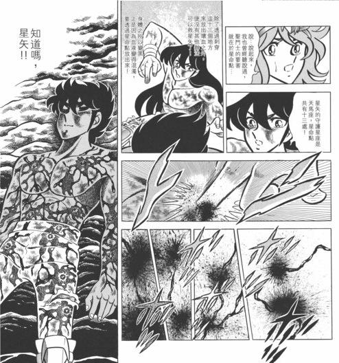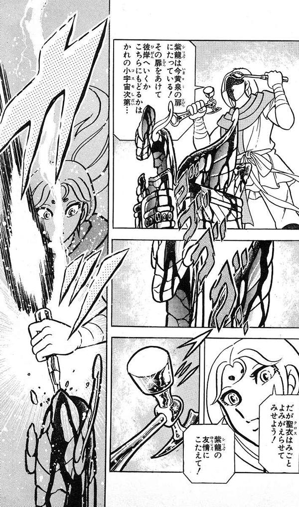 no funciona dos veces contra un Saint” A lo largo de los sucesivos combates aprendemos que los Saints estaban tan dotados en el arte del combate que una misma técnica (ofensiva o defensiva) no podía ser usada efectivamente dos veces sobre el mismo Saint. Las técnicas de los Saints adolecen de un defecto de "deja-vu", una vez vistas ya no tienen los mismos efectos en el contrario. Kurumada no introdujo esta “regla” hasta que aparecieron los Black Saints, específicamente en la parte en que Phoenix Ikki pelea con Cygnus Hyōga. Es cierto que no se cumple a veces, de hecho, en la pelea de Seiya y el Shiryu en el torneo Galaxian Wars ambos experimentan las técnicas secretas de cada uno varias veces y no pierden efecto. Sólo descubren la mecánica de cómo funcionan pero no son capaces de evitarlas. Kurumada no le dio más profundidad al concepto hasta más adelante, en el arc de los Black Saints, y quedó establecido desde ahí. La regla según la cual "una técnica no funciona 2 veces contra un Saint" es bastante absurda considerando que los Saints no tienen tantas técnicas de ataque a su disposición. Incluso algunos sólo tienen una!!!. Si esa afirmación fuera cierta y no se matan en el primer ataque después la pelea no debería terminar nunca. Además, debido al cansancio nunca van a poder evadir eternamente un mismo ataque. Alguno de los 2 contendientes eventualmente caerá y evidentemente eso va a tardar menos de 1000 días, que es otra de las cosas que nunca pasaron. El funcionamiento de un ataque está conectado directamente con el cosmos del oponente. La regla se aplica si una de las partes no hace nada para cambiar la situación, para elevar su cosmos. A partir de esto, si el poder se intensifica el golpe pasa a tener una nueva autonomía, rompiendo la regla. Aquí dos instancias en que ocurre y como se menciona en japonés: