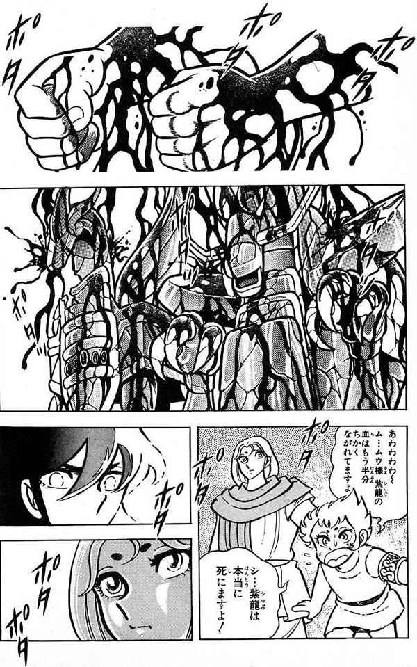 La guerra estalló y la Tierra, territorio de Atenea, fue invadida. Los caballeros de Atenea se enfrentaron a las Marinas de Poseidón. Las luchas fueron intensas, pero las marinas y sus escamas no encontraron resistencia en los guerreros de la superficie y comenzaron una verdadera masacre, muchos héroes de la tierra fueron derrotados. Por aquel entonces los santos, jóvenes de tiernas edades, luchaban sin armas ni protección para sus cuerpos, sólo podían utilizar sus puños mientras que los generales estaban provistos de corazas. Al principio, los jóvenes guerreros atenienses lucharon arduamente usando sus cuerpos como arma, rompiendo el aire con sus puños y quebrando la tierra con sus pies, pero fueron rápidamente derrotados, ya que no podían repeler los ataques de los invasores marinos, aun así, su diosa rehusó permitirles usar armas en combate. Decenas de jóvenes combatientes murieron... La fabricación de los Cloths Aunque Atenea tomó las constelaciones para asociarlos a los Cloths, en el manga original nunca se menciona quien las fabricó ni en qué circunstancias, y simplemente se contenta en precisar de qué materiales están hechos. Según el Hypermyth, sus creadores fueron los alquimistas del continente desaparecido de Mü, quienes habrían hecho este trabajo a petición de Atenea. Su fabricación habría sido una respuesta al ejército de Marinas protegidos por Scales creadas por Poseidón, y el Taizen enfatiza sobre este punto sugiriendo que la razón por la cual las Scales de los Marinas, hechas también de Orichalcum, se rompen muy fácilmente en pedazos bajo los golpes de los guerreros vestidos de Cloths diseñados especialmente para destruirlos. Los muvianos construyen las Cloth