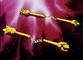 Cuando Shiryu hace su show omite mencionar a los Nunchakus triples, quizás porque sea muy justa la sincronización palabra/imagen o porque los traductores no sabían a que correspondía ese arma... ^^