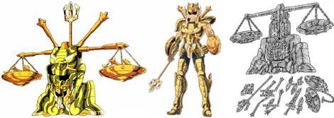 técnica especial patrimonio de Shura. Gran animación creada por fans chinos desde el foro de All4Seiya Se supone que en caso de problemas, cada gold debe escoger una y hop, si la necesita después debe coger la misma pues ya la conoce, un arma nominativa es algo más difícil de demostrar. Está claro que las armas no son atenienses, fueron concebidas por el pueblo de Mu a quien Atenea encargó 12 armas, deducimos que como grandes profesionales recorrieron el mundo en búsqueda de inspiración y tras diversos estudios eligieron esas piezas de armas como accesorios para la armadura. Mucho tiempo después, la especialización guerrera de las civilizaciones griega, china etc.. hicieron que retomaran esos tipos de armas tras comprobar su eficacia (es un buen tema de fanfic, ¿no?). El Reparto de las armas de Libra Nos podríamos preguntar, en el caso de que el Caballero de la Balanza distribuyera las 12 armas a los 12 caballeros de oro que conocemos (como se hizo seguramente durante la guerra contra Ares mencionada en el Hipermito) cuales serían las asociaciones de armas / caballeros (dependiendo de su personalidad y otros factores)