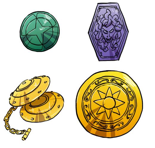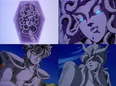 las dos manos al estar bajo la Ilusión del Fénix). - Perseo Cloth (Plata): Ésta armadura incluye el famoso escudo de Medusa, (medusa no tate) Un poderoso escudo con un increíble poder ofensivo, que le otorga al Saint la habilidad de convertir en piedra a sus adversarios. Uno de los accesorios más útiles y mortífeos, sin duda. Su diseño es muy particular, reproduce la cabeza de la gorgona medusa y, conforme al mito, es capaz de transformar en piedra a cualquier adversario que la mire a los ojos, al igual que la Gorgona Medusa en la mitologia griega, sin duda un arma temible. En el anime convirtió en piedra a 3 jóvenes de una sola vez y luego a Shun, Seiya y Spartan. En el manga transformó en piedra a Hyoga. Este escudo es más útil para el ataque que para la defensa, por eso no es especialmente solido para detener golpes, Shiryu, a pesar de estar ciego y de tener un brazo convertido en piedra, consiguió partirlo de un solo puñetazo.