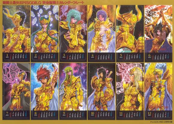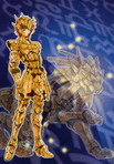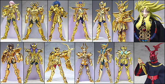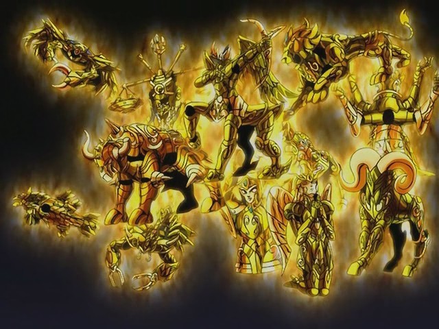 · LOS 12 CABALLEROS DE ORO (12/12) · CABALLEROS DE ORO, GOLD SAINTS 黄金聖闘士 (ゴールド セイント) (en furigana pron. jp. Gooorudo no Seinto), literalmente: 黄金: oro, 聖闘士: guerrero sagrado. ARMADURAS DE ORO, GOLD CLOTHS 黄金聖衣 (ゴールド クロス) Ōgon Seigi (en furigana pron. jp. Gōrudo Kurosu), literalmente: 黄金: oro, 聖衣: vestimenta sagrada. Ellos son la cumbre de la jerarquía de los Saints de Atenea, la más alta de las tres órdenes de Caballeros, los seres que mejor dominan el cosmos y dominan el séptimo sentido. La guardia de elite de Atenea la componen 12 caballeros en total, uno por cada una de las 12 constelaciones del Zodíaco occidental, los Gold Cloths son el epítome de la perfeccion entre los Cloths y representan a las 12 constelaciones del Zodiaco occidental, los 12 signos ubicados en la eclíptica o trayectoria anual aparente del Sol en la esfera celeste, tal y como se ve desde la Tierra, se denomina así debido a que los eclipses tienen lugar solamente cuando la Luna se encuentra en esta trayectoria o cerca de ella: Aries, Tauro, Géminis, Cáncer, Leo, Virgo, Libra, Escorpión, Sagitario, Capricornio, Acuario y Piscis. Los Gold Cloths se caracterizan por un majestuoso porte y radiante brillo dorado. Las capacidades defensivas de los Gold Cloths son incomparables, siendo prácticamente indestructibles, sin haber recibido daños graves desde la era de los mitos. Es tal su resistencia que sólo el poder de un dios es capaz de destruirlas por completo. Todas las capacidades de protección y amplificación de Cosmo que poseen los Bronze y Silver Cloths se multiplican hasta el paroxismo en los Gold Cloths. Los Gold Cloths sólo pueden ser vestidos por los Gold Saints, cuyos signos zodiacales deben corresponder con el Gold Cloth que tienen destinado. Los Gold Cloths conceden tambien el honor de ser vestidos a aquellos Saints verdaderos, que pelean sólo por la justicia, la paz y el amor, y que sean totalmente fieles a Atenea, en la misma forma que los Cloths, Bronze, Silver y Gold, lo son, aun cuando esos Saints no pertenezcan al rango de los Gold Saints o su signo zodiacal sea diferente al representado por el Cloth, como sucedió cuando el Capricorn Gold Cloth envolvió a Dragon Shiryū, que es de signo Libra. Los Gold Cloth sólo aceptan al siguiente Saint como sucesor cuando hay razones para esto. Pero envolver el cuerpo de un Saint momentáneamente no implica que los acepten como sucesores. Los Gold Cloths son capaces de invocarse unos a otros y también pueden desplazarse a voluntad en forma de estrella fugaz. La capacidad de amplificacion de Cosmo que otorgan a su portador es milagrosa: un Bronze Saint es normalmente capaz de moverse a un máximo de Mach 1, es decir superando la velocidad del sonido ligeramente, son incapaces de detectar o bloquear movimientos o ataques de una velocidad superior a Mach 1, al vestir un Gold Cloth, los Bronze Saints experimentaron un incremento dramático en su capacidad de ataque y velocidad de movimientos, logrando detectar y detener ataques a la velocidad de la luz y lanzar ataques del mismo nivel de poder y Cosmo que el de los Gold Saints, aunque este efecto es temporal, y mucho menos eficaz que en un Gold Saint capaz de moverse a la velocidad de la luz y utilizar el maximo potencial de Cosmo debido a la posesión innata y al despertar de su 7º sentido constantemente. Es la combinación del dominio del 7º sentido con la capacidad amplificadora de Cosmo de los Gold Cloths lo que convierte a los Gold Saints en tan formidables y terribles oponentes. De forma similar a los Silver, debido a sus excepcionales cualidades y al poder puro de los Gold Saints, los Gold Cloths no necesitan de habilidades especiales o adicionales, aunque es posible mencionar algunas características singulares que no son parte de las propiedades comunes de los Cloths, los accesorios que incluyen las Gold Cloths de Libra y Sagittarius.