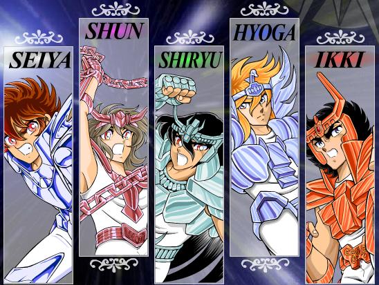 DE BRONCE De izquierda a derecha : Seiya de Pegaso, Shiryu de Dragón, Hyoga de Cisne, Shun de Andrómeda, Ikki de Fénix, Nachi de Lobo, Ichi de Hidra, Geki de Oso, Ban de León Menor, Jabu de Unicornio y June de Camaleón. Como habéis podido observar, físicamente no hay grandes variaciones entre los caballeros de bronce del manga y los del anime, no obstante, no ocurre lo mismo con los diseños de las armaduras, mucho mas recargadas en su versión televisiva, sobretodo las de los cinco protagonistas. El hecho es que todas las armaduras de los caballeros de bronce, incluidos los secundarios, sufrieron ligeras variaciones en el diseño de los cascos y corazas.