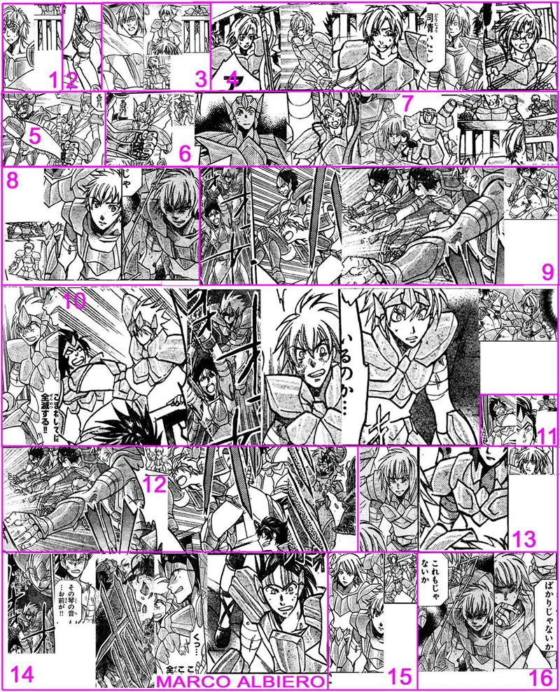 En el manga precuela Saint Seiya The Lost Canvas, que narra la anterior Guerra Santa entre Atenea y Hades, aparecen muchos personajes de relleno que los fans optan por denominar "carne de cañón" (en ambos bandos, ya sean Saints o Specters), tantos que se hace muy pesado y metódico contarlos, clasificarlos y registralos, habría que preparar una tesis. Se aprecia como algunos llevan armaduras inéditas y es prácticamente imposible deducir ni adivinar quien son si no nos lo dicen, y no digamos asociarlos con el manga clásico, ello hace que perdamos las cuentas, muchos opinan que es una irresponsabilidad tremenda de Shiori y de Kurumada que esten apareciendo tantos santos y specters sin nombre, rango y mucho menos sin constelación ni estrella, personajes meramente secundarios destinados a morir y que no tienen mucha importancia, están ahi como decorado, tan sólo se saben las constelaciones y rango de los saints alumnos de El Cid, ¿tanto les costaría nombrarlos y definirlos a todos como hace por ejemplo Okada en el Episode G?, se están poniendo al nivel del anime con esos añadidos. En las siguientes imágenes podréis apreciar en detalle el embrollo que crea en la comunidad de fans, que si ya estaba conmocionada por enumerar a los 88 saints ahora tiene otro entretenimiento. |
