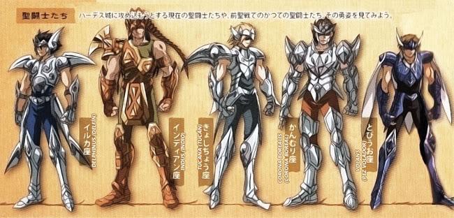 ¿Cómo se planteó el diseño de las armaduras sagradas (cloth) en la versión animada? Araki: "Aquella fue una época difícil. Yo realmente sufrí mucho por culpa de las armaduras (risas). En verdad, las primeras armaduras (cloth) que debieron ser diseñadas como muestra eran la versión del manga original. Bandai vendería posteriormente las figuras, entonces la forma de las armaduras fue alterada para que fueran materializadas fácilmente. Después de eso, fue más difícil. A pesar de que las armaduras eran un elemento importante que reflejaba las características de los protagonistas, no gustaban mucho los diseños tipo "máquina" (risas). Entonces, después de muchos intercambios de ideas con Bandai, conseguimos enfatizar una forma adecuada a las creaciones. Finalmente las desarrollamos en base a las respectivas imágenes de los animales (Araki se refiere a las imágenes formadas por los totems de las armaduras, cuando no están en el cuerpo de los caballeros), sin romper con el manga original". - La armadura del Cisne es un vestigio de la 4ª glaciación, permaneció hundida en un glaciar de hielos eternos. El caballero del Cisne es dueño del polvo de diamantes, un viento que congela todo lo que toca hasta el grado del cero absoluto. El Cygnus Cloth posee un efecto de congelación y frialdad al tacto, lo que confiere proteccion extra al portador al ser dificil de tocar debido a su temperatura. - La armadura de Pegaso es célebre pues pertenece al único humano que en el pasado logró herir a un dios (Hades). El caballero de Pegaso tiene una tremenda velocidad que es capaz de aumentar progresivamente y que le permite lanzar cientos, o hasta miles, de golpes con la potencia de un meteoro en segundos. El Pegasus Cloth, al igual que otros Bronze Cloths, posee alas que le permiten a su portador planear con facilidad. - La armadura del Dragón está formada por placas de orichalcum, aglutinadas como escamas, dispone de un puño y un escudo más duros que el diamante, el ropaje en si debe su dureza al hecho que fue bañado durante siglos bajo la gran cascada de Rozan (China) formada por polvo de estrellas de la Vía Láctea que cayó del cielo, el traje sagrado del Dragón permaneció en reposo en el lecho de esa cascada, bañado por el peso aplastante de las aguas de galaxias, desde los tiempos inmemoriales. Por eso el escudo de la constelación situado en el brazo izquierdo es el más resistente de los escudos. El Dragon Cloth posee una dureza extrema, aun mayor que la del carbono, que es el elemento más duro conocido. - La armadura