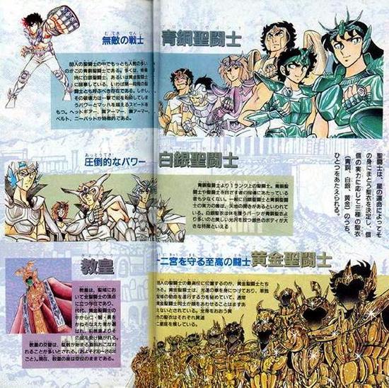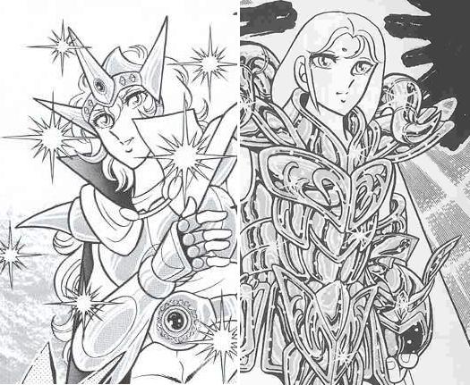 Fijaos como los ghost saints benefician de una puesta en color similar a los silver saints, sin reflejos negros... únicamente tonalidades degradadas oscuras del color principal de su armadura. Para el color de las armaduras de plata, el problema es que algunos se basan en lo anime, pero en el manga todas las armaduras de plata eran de color plateado... Pasa lo mismo con algunas armaduras de oro que se vieron añadir tonos naranjas sobre algunas partes en el anime, mientras que en el manga eran íntegramente doradas. Algo parecido sucede en el manga, para diferenciar los rangos de las armaduras en las páginas en blanco y negro, Kurumada coloca diferentes tonos y contornos blancos, grises y negros, con estrellas superpuestas en las corazas que simbolizan los brillos y destellos del metal. En las páginas en color Kurumada usa múltiples colores para el rango de bronce, gris con alguna estrella para el rango de plata y amarillo anaranjado con pequeños puntos y estrellas blancas para el rango de oro.