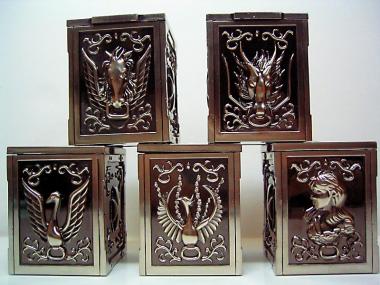 azul El único color que no se muestra en el manga es de Chameleon. En Next Dimension los colores representan tonos más oscuros del manga clásico. En el Episode G y Lost Canvas, las Cloths de bronce de los cinco protagonistas son semejantes al manga original. Por el contrario, en el Lost Canvas las Cloths de bronce de los Bronze Saints secundarios son más parecidas a la versión anime, donde tienen diversos colores y no necesariamente coinciden con los colores del manga. En el manga original, las Cloths de Pegasus y Cygnus tienen exactamente el mismo color. Pero sólo el manga Lost Canvas sigue el mismo, incluso los Cloth Myth OCE de Pegasus y Cygnus son diferentes. En el manga original, las Pandora Boxes de las Cloths de bronce son de color ... bronce. Por supuesto, las de plata serían de color plateado (pero esto nunca fue mostrado). En Next Dimension, inicialmente las Pandora Boxes de bronze tienen un color metálico oscuro. Pero la diferencia con las Cloths de plata parece que se ha perdido posteriormente. El color del Next Dimension parece haber sido basado en el anime, que es metálico. En el manga Lost Canvas, las Pandora Boxes parecen tener el mismo color de la armadura, y en el caso da la Cloth de Pegasus es de color azul. Visto lo que hay, existen dos tipos de colorizaciones (Manga/Anime) de las 10 armaduras de bronce de los Caballeros del Torneo galáctico, considerando los colores originales del manga (mostrados en las portadas de los volúmenes y en imágenes especiales) nos damos cuenta que se agrupan por parejas (con una sola excepción) ... blanco azulado : Pegaso y Cisne verde esmeralda: Dragón