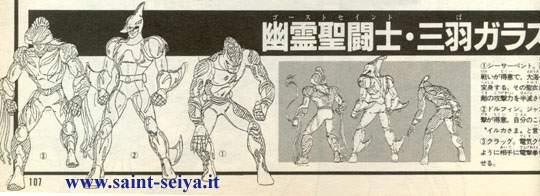 de Marco Albiero (Italia) Se trata de aquellos "caballeros" (Caraib Ghosts Saints) con ropajes acuáticos (fuera de lo ordinario) que aparecen al principio de la serie TV, vivían exiliados en la Isla Espectro (Makai tô) fueron reclutados por Gigas para intentar recuperar el casco de la Cloth de oro de Sagitario y lograron robarlo. Se dice que varios años antes de 1986 fueron expulsados del Santuario y estaban desterrados en la isla por orden del Patriarca (ya fuera Shion o Saga en estado gentil) debido a sus métodos terroristas y las catástrofes naturales que provocaban (parece que querían deshacerse de los petroleros), y se refugiaron en la isla donde permanecieron, tomando el nombre de Ghost Saints. Saint Seiya Serie de TV, episodios 18 y 19. A ellos se les ofrece la posibilidad de regresar si acaban con los Caballeros de Bronce y recuperan el casco dorado de Sagitario. -