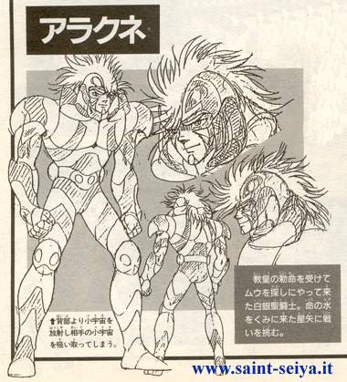 ARACNE (Araña o Tarántula) : Presentado como Caballero de plata en los Artbooks Gold Jump, validado como Silver, como Pavo Real y Lotus... difícil es atribuirle una constelación asociada a sus poderes y armadura. Seguimos teniendo el problema que hay entonces 25 Silver en vez de 24, debido a Okada... No se tienen informaciones sobre los guerreros sin constelaciones: ¿armaduras fabricadas recientemente? se puede suponer que alquismistas modernos intentaron fabricar armaduras de plata. Arachne aparece en el episodio 35, donde se enfrenta a Seiya, los guionistas metieron la pata con este Caballero, por varias razones: - no tiene constelación pero se define como Caballero de Plata - no tiene un aspecto especialmente resistente, puesto que Seiya lo tumba de un sólo golpe tras haber revestido su armadura (los demás Silvers resistieron más que eso...) ; da como la impresión que Seiya ni siquiera tuvo que ejecutar todos los golpes de su Meteoro para matarlo... en cualquier caso, de la manera en que el anime lo presenta, parece que Seiya da un único golpe tras pronunciar el nombre de su ataque... Las únicas cosas que interesantes de Arachne son su postura de combate (recogido cerca del suelo, como una araña) y su técnica secreta (Tarentula Net), que absorbe el cosmos de la víctima y no es similar a ninguna otra en toda la historia. En conclusión, todo lo que se puede decir es que Arachne fue tratado como un luchador vulgar, que los escenaristas expedientaron rápidamente...