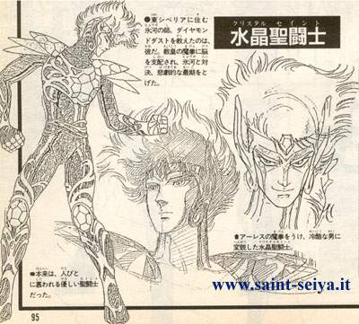 Enlace a Fanart de Cerberus Rack (Brasil) CRISTAL (Crystal Saint): Un Santo diferente pero importante en el anime, levantó discusiones en cuanto a su nombre. El caso de cristal es muy misterioso, hay muchas dudas respecto a su armadura. En la peor de las hipótesis seria una Armadura de Plata o Bronce. O ni siquiera una Armadura de Atenea (de entre las 88, algún otro tipo). Muchos fans asocian a Cristal con la constelación de Corona Boreal. Cristal es uno más de los personajes inéditos del Anime, que sirven para que la serie TV no sobrepase al manga (pues gran parte del volumen 1 del manga original fue consumido por 2 episodios de la TV), en ese momento de la historia, sólo había constelaciones para los hermanos de Seiya, aquellos que representaban a Saori, Sagitario era la única cloth de oro y por entonces los santos de plata aun no habían aparecido en el manga. Cuando Hyoga fue presentado no tenía maestro conocido – Seiya tenia a Marin, Shiryu a Roshi y Shunrei, Shun e Ikki existían para apoyarse mutuamente- por eso sólo Hyoga no tenía espina dorsal ni backgraound en su composición, el anime se avanzó para llenar ese vacío. El maestro de Hyoga apareció antes en el Anime que en el manga, por eso se optó porque Cristal fuera un maestro intermedio. Fue considerado el Cristal como “un poco más” de hielo. Según el Gold Jump n°1, consagrado al anime, Cristal es un ex-santo, retirado, pero eso es aberrante y no tiene sentido. El Taizen sólo se basa en el manga y allí hay nula mención sobre Crystal. Como pasa con Docrates, Geist y otros errores repelentes, Cristal es nombrado “caballero mercenario”. No forma parte de ninguna casta. Asociarlo con los Blue Warriors sólo es un rumor, sabiendo que en el manga Crytal no existe y se vio bien que los Blue Warriors, aunque no se sabe cuántos son, deben ser pocos a causa de las condiciones climáticas del lugar de origen y que la casta parece en declive. Por otra parte, no parece que Blue Graad exista en el anime. Como conclusión pues, para poder entender a Saint Seiya uno debe fiarse del manga.