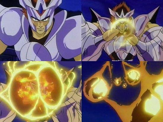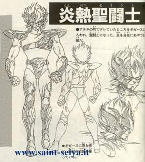 sobre "Cristal": En 1978 Cristal (que ya parece tener la edad de Camus en esa epoca del anime) asume a un alumno llamado Isaak (que tiene alrededor de 6 años). En 1979, Kido, consciente de los distintos lugares posibles de entrenamiento y obtención de una armadura de Santo, enviará a Hyoga (que tiene entonces 7 años) a Siberia para que sea entrenado por ese famoso guerrero Cristal, Camus tiene 13 años aproximadamente y concederá a Cristal la custodia de este niño venido de Japón, para merecer la armadura de Bronce del Cisne, que se encuentra desde hace tiempo encerrada en un glaciar. Tres años más tarde (en 1982según el manga, Tomo 16), Hyoga tiene casi la misma fuerza que Isaak (que tiene por otra parte la misma edad que él), tienen ambos alrededor de 10 años y Camus 16 años. Camus a menudo es llamado por el santuario, ya que la duda planea sobre el Gran Patriarca. 5 años después de la llegada de Hyoga (en 1984) Isaak desaparece... En 1986, Cristal sufre el ataque de Saga (ya que Giggar necesita de él). Conclusión 1: Cristal era el antiguo Santo de Bronce del Cisne, alumno de Camus, luego se retiró. El santuario le fabricó una armadura en cristal en reconocimiento. Período fantasioso durante el cual podía ser el Santo de Bronce del Cisne: 1976-1977-1978 en líneas generales. Luego se volvió instructor y su alumno Hyoga sacó la armadura del Cisne del glaciar en 1986. Conclusión 2: No sirve de nada romperse la cabeza por tan poco, Cristal fue creado para el anime, la gente que lo hizo quiso poner de manifiesto que él era el maestro de Hyoga y que utilizaba sus mismas técnicas... nada más simple que de hacer un copiar y pegar, y le pusieron un cisne y una armadura azules, así como Hyoga representa un cisne blanco y lleva una armadura blanca... Francamente, ¿de qué sirve romperse la cabeza para aclarar una adición del anime tan poco importante? ![]() CABALLERO DE LA LLAMA (Ennetsu Saint = santo del calor sofocante / Incendiary Saint o Hagure Saint = Saint misterioso): Es el caballero de la Llama Ardiente (Ennetsu Saint = "llamas infernales" o "calor sofocante").