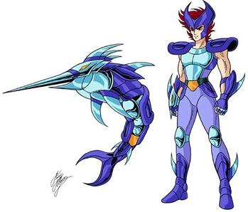 Algunos fans sugieren que podría ser el caballero del Delfín o el Espadon (antiguo nombre de la constelación del Dorado) o del Pez Austral o Volador, ya que como podéis ver en estas capturas tenía una especie de aletas parecidas a las de un animal marino en sus brazaletes y en la perneras, y sus hombreras podrían imitar la cabeza de un delfín, luce dos círculos en el yelmo que bien podrían ser los ojos.