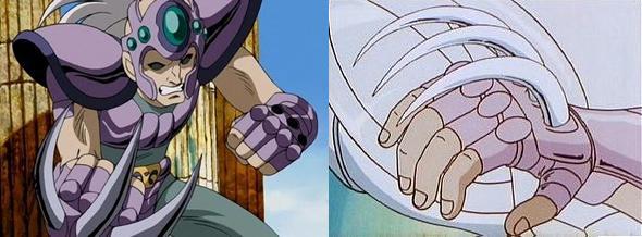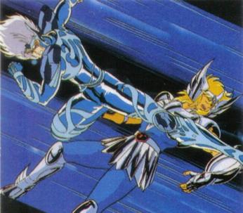 Shaina y Seiya están luchando: Claro que podría ser un fallo de la traducción. Ni en la versión francesa ni japonesa original no está del todo claro. ¿compañeras de entrenamiento? ¿antiguas rivales por la misma armadura? aunque Geist fuera inventada por Toei no hay que descartar que entrenaran juntas en el Santuario muchos años atrás, pues ambas usaban la misma técnica: La Garra del Trueno (a las dos les crecen las uñas), por lo tanto podrían haber tenido el mismo maestro... Quizás pudieran representar a constelaciones del mismo tipo, Serpiente y Serpentario (Ofiuco) ¿por qué no?, aunque no sea muy corriente el caso en Saint Seiya : Cisne y Acuario, Flecha y Sagitario, Centauro y Capricornio, Andrómeda, Cefeo y … Casiopea. De todos modos, si bien sabemos que Shaina es caballero de plata, no sabemos la naturaleza de la armadura de Giste, aunque por el colorido podría ser perfectamente de plata.