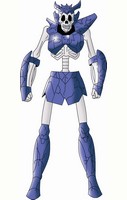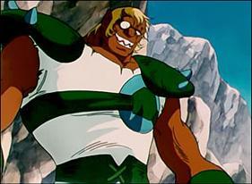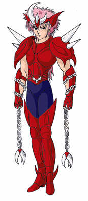 Se trata de un mastodonte como Cassios, sin armadura y aparentemente sin poderes cósmicos, pues no le vimos ejecutar ninguna técnica, sólo usaba la fuerza bruta, fue capaz de intimidar y retener a una amazona de plata con su fuerza física, algo impensable... como casi todos los personajes añadidos del Anime. Su aparición en la serie TV no fue más que testimonial, Jaki y Marin cayeron por un precipicio y nunca más se supo de él.