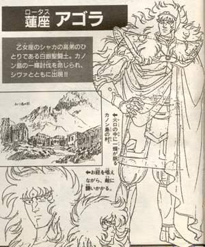 Así como la armadura de Giste tiene el signo de la Flor de Lis, tal vez Agora pudiera ser el caballero de la antigua constelación del "Ramo" que siempre fue representada por una flor (esta viene representada bajo la forma de tres serpientes enroscadas alrededor de una rama del ramo sostenida por la mano izquierda de Hércules), y eso dejaría a libre elección que flor podría ser la armadura. Hoy en día esa constelación ya no figura en la mayoría de los mapas. Puede que los de Toei Animation usaran la constelación del Ramo y le cambiaran el nombre, no seria extraño, ya que Kurumada usó una constelación desaparecida con el caballero de Cerbero. Como su compañero Shiva de Pavo, Agora fue presentado como alumno aventajado de Shaka y vestía una armadura que mezclada con ropa recordaba a los atuendos de los monjes budistas, el caso es que mientras la constelación de Pavo (Shiva) existe en el mapa del cielo entre las 88 oficiales (hace referencia al ave con el plumaje más bello), no hay indicaciones sobre la constelación del Lotus en la historia. Tampoco existe una relación mitológica entre Loto, Pavo y Shaka. En cambio si existe referencia mitológica entre Agora y Shiva, pues en el hinduismo ambos nombres corresponden a dos deidades gemelas. Según la ficha oficial de Agora impresa en el Jump Gold Selection se puede ver el kanji (símbolo japonés) del Loto como el signo de Agora, y arriba también se leen los katakanas que significan LoTaSu (Loto). Mientras que en el doblaje original de la serie TV se le presenta como caballero del Lotus, en ese momento aparece tras él la imagen del Loto, y su armadura no parece que represente a las hojas de laurel.