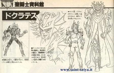 - No puede ser un Berserker de Ares (ya que están encerrados en los calabozos del Hades !) o un gigante de Tifón (leer Gigantomachia !) como algunos fans puedan suponer... - Visto el momento de su aparición, y su especial relación con Cassios y Shina, sería perfectamente creíble que fuera un caballero de bronce, bastante poderoso eso sí, porque es difícil creer que los guionistas del Anime avanzaran tan pronto la entrada en escena de los caballeros de plata, muchos antes de Misty de Lagarto ; - Vistos sus poderes, su ataque se llama : "Heracles Môshûken" y significa "Ataque de fuerza de Hércules", muchos fans apuntan que sería lógico pensar que fuera un discípulo de Algethi, Silver Saint de Hércules, pues existen muchos otros casos de identidad de técnicas entre alumnos y maestros, como Marin, maestro de Seiya, que utiliza también meteoros (¿en relación con el Águila?); Dohko que utiliza el Tigre o el Dragón de Rozan (¿en relación con Libra?) ; Daidalos que utiliza su cadena como su discípulo Shun (en relación con Cefeo, rey de Etiopía no encadenado ?) ; Fijémonos en las diferencias entre ambos : - Algheti es un personaje original del manga, creado por Kurumada, y Docrates es un personaje creado por Takao Koyama, guionista principal del anime. - Algheti es el Silver Saint de Hércules. Su ataque se llama Kornephoros y es lógico. En griego kornephoros significa literalmente "portador de maza", por ese detalle reconocemos la iconografía popular de Herakles. - Docrates no es un Saint. Aunque su ataque es Herakles Môshûken (Ataque de la fuerza de Herakles, en sustancia) ello no hace de él un Saint de Herakles. En el artbook Jump Gold 1, se nos precisa que es un Shihei Saint del Gran Pope, a saber, un caballero de la guardia personal del Pope. Categoria a la cual pertenece también el Ennetsu Saint. En sus apariciones jamás se dijo su rango o constelación, si es que tiene una, pues los artbooks lo califican de "sonota saint" o "mercenario" afiliado al Santuario (información que no es de mucha ayuda), algunos elementos visuales nos pueden sugerir que sea el caballero de la Hidra de Lerna, la criatura mítica, un monstruo asimilable a un dragón reptil que vivía en el pantano de Lerna, que tenía 9 cabezas y que fue vencido y aniquilado por Hércules en cumplimiento de uno de sus doce trabajos, pero según los vínculos entre la mitología griega y la astronomía, esta criatura se corresponde con la constelación que protege al caballero de bronce Ichi (Hydra). No obstante, no podemos negar las semejanzas entre la bestia mitológica y el diseño de la armadura de Docrates, la cual imita una criatura con formas acuáticas y que se compone de unas corazas con representaciones de 9 cabezas de monstruos, como la legendaria Hidra de Lerna. LAS 9 CABEZAS